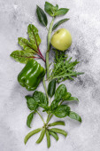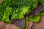 Salad, parsley and dill on a dark cutting board against a blue concrete background. Cooking a vegetarian dish with fresh greens