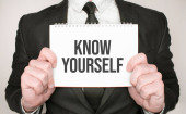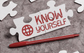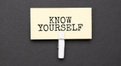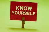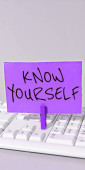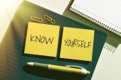 Text sign showing Know Yourself, Concept meaning Find You Understanding Strength and Weaknesses Identity Important Informations Written On Piece Of Wood On Floor.