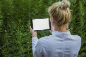 cropped photo of female farmer with a tablet computer in a soy field touches the leaves and writes data to the program. Organic smart farming and digital farming in the agriculture industry