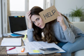 Zdjęcie "Młoda para martwi się w domu w złej sytuacji finansowej stres z prośbą o pomoc" może być wykorzystywane do celów osobistych i komercyjnych zgodnie z warunkami zakupionej licencji Royalty-free. Obraz jest dostępny do pobrania w jakości wysokiej rozdzielczości do 5760x3840.