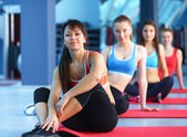 Piękna kobieta siedzi na niebieski mat .