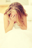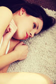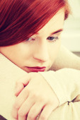 smutne, martwi się piękne kaukaski kobieta siedzi w swetrze.