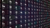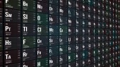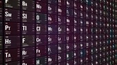 The futuristic background of the periodic table of the chemical elements in perspective with their atomic number, atomic weight, element name and symbol on a black background