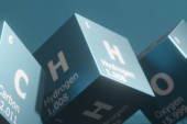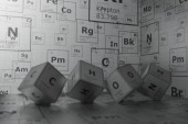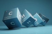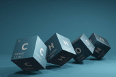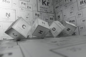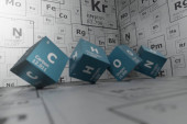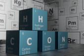 Background of 3d cubes of the elements of the periodic table, carbon, hydrogen, oxygen and nitrogen, background for education, science, technology and engineering