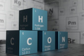 3D rendering of the elements of the periodic table, carbon, hydrogen, oxygen and nitrogen, science and engineering background. 3D illustration