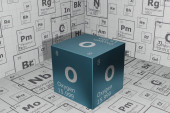 Oganesson, 3D rendering of symbols of the elements of the periodic table, atomic number, atomic weight, name and symbol. Education, science and technology. 3D illustration