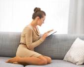 Młody gospodyni siedząc w salonie i czytania magazynu