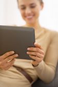 Młoda kobieta przy użyciu komputera typu tablet, siedząc na kanapie