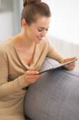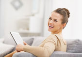 Portret szczęśliwy młoda kobieta siedzi na kanapie i za pomocą tabletki p