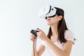A young girl plays in virtual reality. White VR-glasses. The concept of the metaverse and games. Focus on the girl's hand and on the controller.