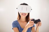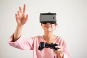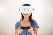 Zdjęcie "A young girl plays in virtual reality. White VR-glasses. The concept of the metaverse and games. Focus on the girl's hand and on the controller." może być wykorzystywane do celów osobistych i komercyjnych zgodnie z warunkami zakupionej licencji Royalty-free. Obraz jest dostępny do pobrania w jakości wysokiej rozdzielczości do 5760x3840.