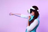 Młoda kobieta używająca gogli wirtualnej rzeczywistości. Izolacja na pomarańczowym tle.