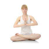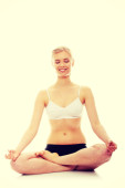 piękna kobieta dorywczo w białej bieliźnie robi ćwiczenia.