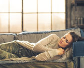 Zrelaksowany młoda kobieta siedzi w loft Apartament