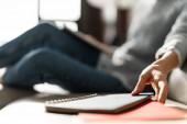Zbliżenie na młoda kobieta siedzi z komputera typu tablet w loft Apartament