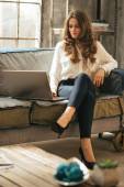 Portret szczęśliwy młoda kobieta przy użyciu komputera typu tablet w loft Apartament