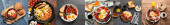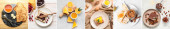 Collage of tasty toasts with jam, chocolate paste, butter, bacon and herbs, top view