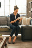 Pełnej długości piękny portret młodej kobiety z paszport, bilet i lu