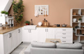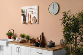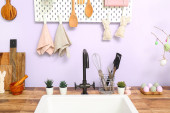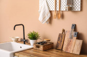 Zdjęcie "kitchen counters with sink and utensils near beige wall" może być wykorzystywane do celów osobistych i komercyjnych zgodnie z warunkami zakupionej licencji Royalty-free. Obraz jest dostępny do pobrania w jakości wysokiej rozdzielczości do 5760x3840.