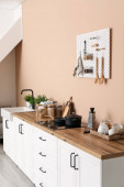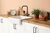 Zdjęcie "kitchen counters with sink and utensils near beige wall" może być wykorzystywane do celów osobistych i komercyjnych zgodnie z warunkami zakupionej licencji Royalty-free. Obraz jest dostępny do pobrania w jakości wysokiej rozdzielczości do 5760x3840.
