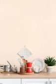 kitchen counters with sink and utensils near beige wall