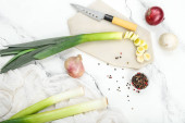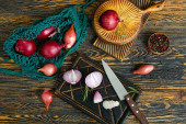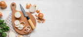 Composition with board of fresh cut onion and knife on wooden background