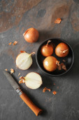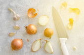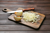 Composition with wooden board of cut onion on light table, closeup