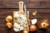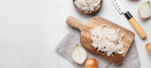 Composition with wooden board of cut onion on light background
