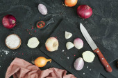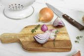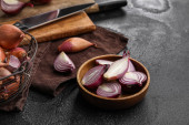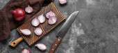 Wooden board with cut red onion on dark background