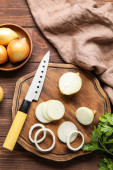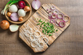 Composition with fresh onion and parsley on light wooden background