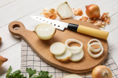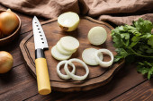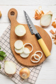 Wooden board with fresh onion on grunge background