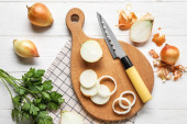Zdjęcie "Wooden board with fresh onion on grunge background" może być wykorzystywane do celów osobistych i komercyjnych zgodnie z warunkami zakupionej licencji Royalty-free. Obraz jest dostępny do pobrania w jakości wysokiej rozdzielczości do 5760x3840.