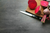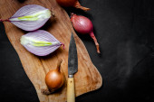 Board with cut red onion and knife on light wooden background