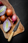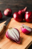 Board with cut red onion on light wooden background, closeup