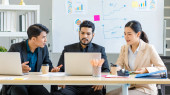 Group of millennial Asian Indian multinational multicultural male and female businessman businesswoman teamwork in formal suit sitting smiling brainstorming meeting together in office conference room.