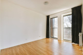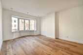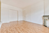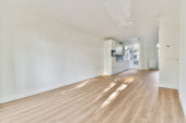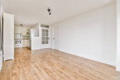 Wnętrze pustej białej kuchni z oknami i drewnianą podłogą parkietową
