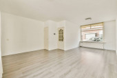 Zdjęcie "Wnętrze pustej białej kuchni z oknami i drewnianą podłogą parkietową" może być wykorzystywane do celów osobistych i komercyjnych zgodnie z warunkami zakupionej licencji Royalty-free. Obraz jest dostępny do pobrania w jakości wysokiej rozdzielczości do 5760x3840.