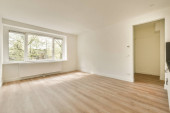 Okno z tworzywa sztucznego i grzejnik na białej ścianie w pustym pomieszczeniu oświetleniowym w domu