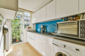 Zdjęcie "Dobrze zorganizowane małe wnętrze kuchni domowej z umywalką pod oknem i lekkie meble z kuchenką i lodówką w mieszkaniu miejskim" może być wykorzystywane do celów osobistych i komercyjnych zgodnie z warunkami zakupionej licencji Royalty-free. Obraz jest dostępny do pobrania w jakości wysokiej rozdzielczości do 5760x3840.