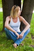 bardzo młoda kobieta stojąc z laptopa w parku lato