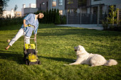 Zdjęcie "Młoda stylowa para siedzieć razem i bawić się ze swoim białym psem na ulicy. Młodzi hipsterzy spędzają razem czas w pobliżu biura na świeżym powietrzu" może być wykorzystywane do celów osobistych i komercyjnych zgodnie z warunkami zakupionej licencji Royalty-free. Obraz jest dostępny do pobrania w jakości wysokiej rozdzielczości do 5760x3840.