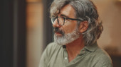 Mężczyzna w średnim wieku z siwymi włosami i brodą spaceruje i rozgląda się. Dojrzały dżentelmen w okularach z torbą na ramieniu przechodzi przez plac na tle miejskiego krajobrazu