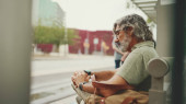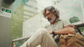 Przemyślany mężczyzna w średnim wieku z siwymi włosami i brodą, ubrany w zwykłe ubrania, siedzi na przystanku komunikacji miejskiej. Dojrzały dżentelmen w okularach z torbą czeka na tramwaj na przystanku tramwajowym