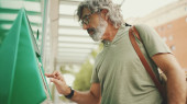 Zdjęcie "Przemyślany mężczyzna w średnim wieku z siwymi włosami i brodą, ubrany w zwykłe ubrania, siedzi na przystanku komunikacji miejskiej. Dojrzały dżentelmen w okularach z torbą czeka na tramwaj na przystanku tramwajowym" może być wykorzystywane do celów osobistych i komercyjnych zgodnie z warunkami zakupionej licencji Royalty-free. Obraz jest dostępny do pobrania w jakości wysokiej rozdzielczości do 5760x3840.