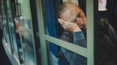 Middle-aged man with gray hair and beard, wearing casual clothes, gets on tram at public transport stop. Mature gentleman in eyeglasses with bag on his shoulder gets on the tram