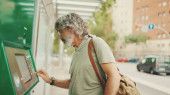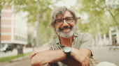 Zdjęcie "Clouse-up, profil mężczyzny w średnim wieku z siwymi włosami i brodą, biegnie palcem wzdłuż miejskiego rozkładu jazdy. Dojrzały pan w okularach czeka na tramwaj" może być wykorzystywane do celów osobistych i komercyjnych zgodnie z warunkami zakupionej licencji Royalty-free. Obraz jest dostępny do pobrania w jakości wysokiej rozdzielczości do 5760x3840.