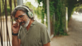 Zdjęcie "Przemyślany mężczyzna w średnim wieku z siwymi włosami i brodą ubrany w luźne ubrania ze słuchawkami na szyi idzie ulicą." może być wykorzystywane do celów osobistych i komercyjnych zgodnie z warunkami zakupionej licencji Royalty-free. Obraz jest dostępny do pobrania w jakości wysokiej rozdzielczości do 5760x3840.