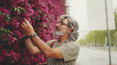 Przyjazny mężczyzna w średnim wieku z siwymi włosami i brodą w luźnych ciuchach słuchający muzyki na słuchawkach. Dojrzały dżentelmen w okularach cieszy się muzyką na zewnątrz