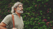 Zdjęcie "Przyjazny mężczyzna w średnim wieku z siwymi włosami i brodą w luźnych ciuchach słuchający muzyki na słuchawkach. Dojrzały dżentelmen w okularach cieszy się muzyką na zewnątrz" może być wykorzystywane do celów osobistych i komercyjnych zgodnie z warunkami zakupionej licencji Royalty-free. Obraz jest dostępny do pobrania w jakości wysokiej rozdzielczości do 5760x3840.