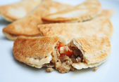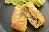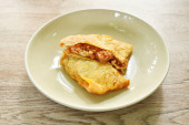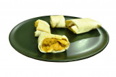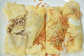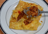 smażona wieprzowina z pomidorem i cebulą nadziewana tajskim omletem jajecznym na talerzu